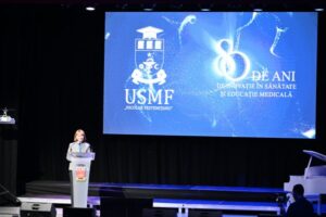 În mesajul său, ministra Sănătății și-a exprimat recunoștința și admirația pentru întreaga comunitate universitară a USMF – profesori, cercetători, medici și studenți – care, de opt decenii, contribuie la formarea specialiștilor de înaltă calificare și la consolidarea sistemului de sănătate din țară.
